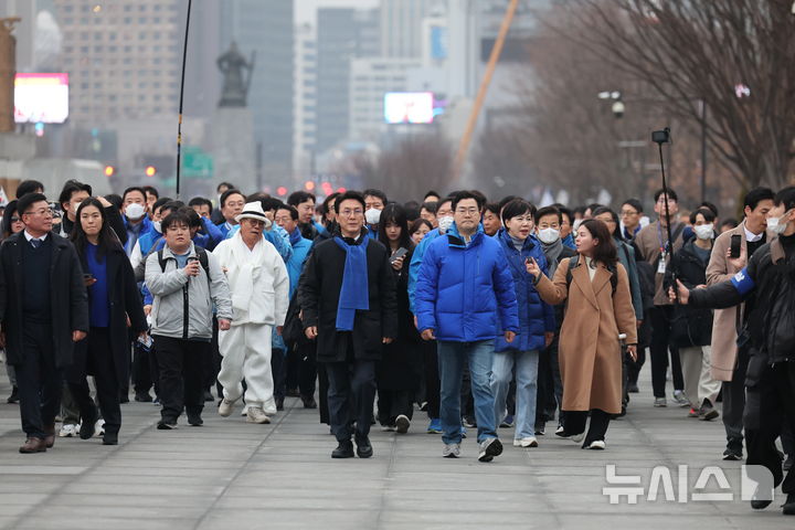 [서울=뉴시스] 김금보 기자 = 국회에서 윤석열 대통령 퇴진을 촉구하며 도보 행진한 더불어민주당 박찬대 원내대표 등 의원들을 비롯한 당원들이 12일 오후 서울 종로구 광화문 광장에 도착하고 있다. 2025.03.12. [email protected]