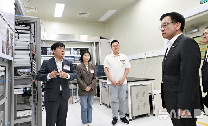 [대전=뉴시스] 조수정 기자 = 최상목 대통령 권한대행 부총리 겸 기획재정부 장관이 12일 대전 한국표준과학연구원에서 열린 양자위원회에 참석 후 초전도양자컴퓨터 연구실을 방문해 연구 현황 등 향후 계획을 듣고 있다. (사진=기획재정부 제공) 2025.03.12. [email protected]