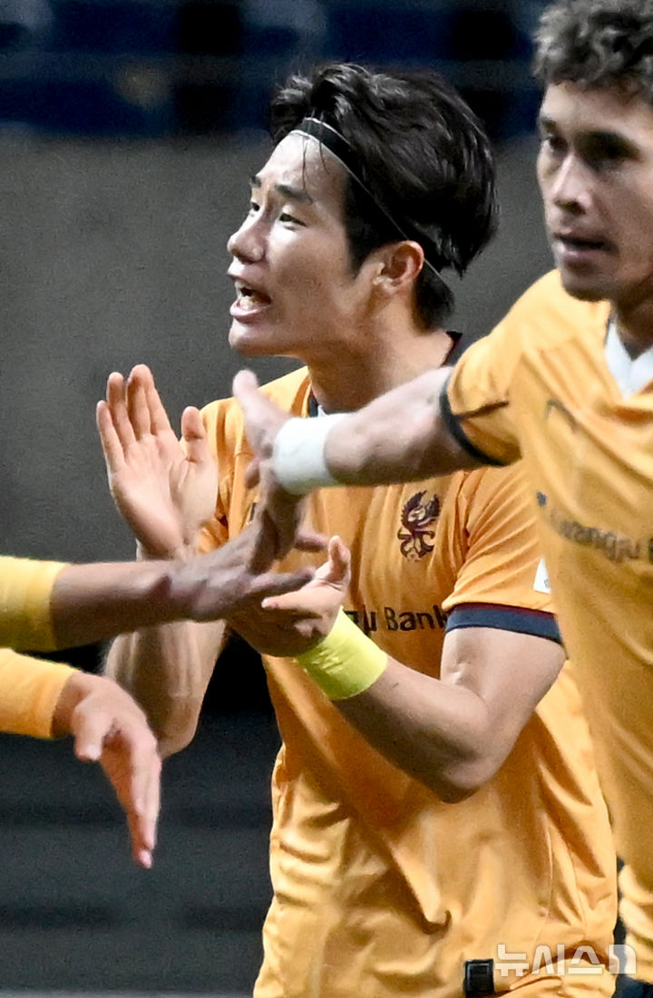 [광주=뉴시스] 김혜인 기자 = 선제골 크로스로 어시스트한 광주FC의 박태준이 12일 오후 광주 서구 광주축구전용구장에서 열린 2024-25 아시아축구연맹(AFC) 챔피언스리그 엘리트(ACLE) 16강 2차전 일본 비셀 고베와의 경기 전반 18분 선제골 이후 기뻐하고 있다. 2025.03.12. [email protected]
