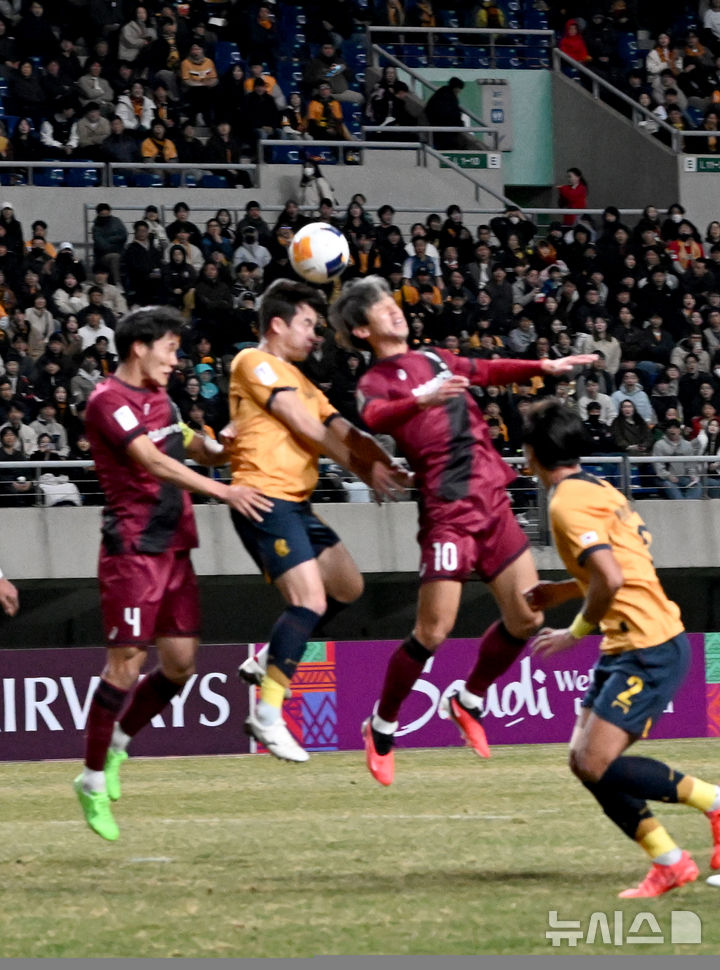 [광주=뉴시스] 김혜인 기자 = 광주FC의 박정인이 12일 오후 광주 서구 광주축구전용구장에서 열린 2024-25 아시아축구연맹(AFC) 챔피언스리그 엘리트(ACLE) 16강 2차전 일본 비셀 고베와의 경기 전반 18분 선제골을 넣고 있다. 2025.03.12. [email protected]