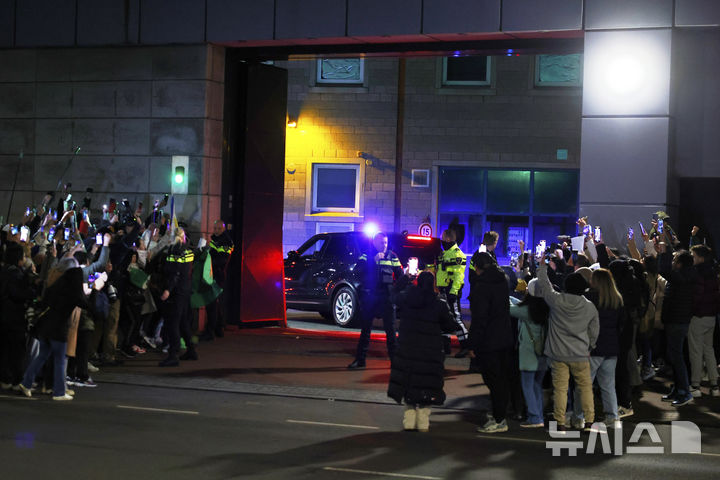 [헤이그=AP/뉴시스] 로드리고 두테르테 전 필리핀 대통령이 탑승한 것으로 보이는 차량 행렬이 12일(현지 시간) 지지자들의 응원을 받으며 네덜란드 헤이그의 스헤베닝겐 국제형사재판소(ICC) 구치소로 들어가고 있다. '마약과의 전쟁'으로 반인도적 살상 범죄 혐의를 받는 두테르테 전 대통령이 ICC 구치소에 수감됐다. 2025.03.13.