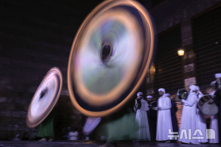 [카이로=AP/뉴시스] 12일(현지 시간) 이집트 카이로의 술탄 알구리 복합단지에서 데르비쉬들이 라마단 성월을 맞아 열린 종교 공연 중 원형무를 선보이고 있다. 데르비쉬는 이슬람 신비주의 종단에 소속돼 평생을 알라에게 바친 사람이다. 2025.03.13.