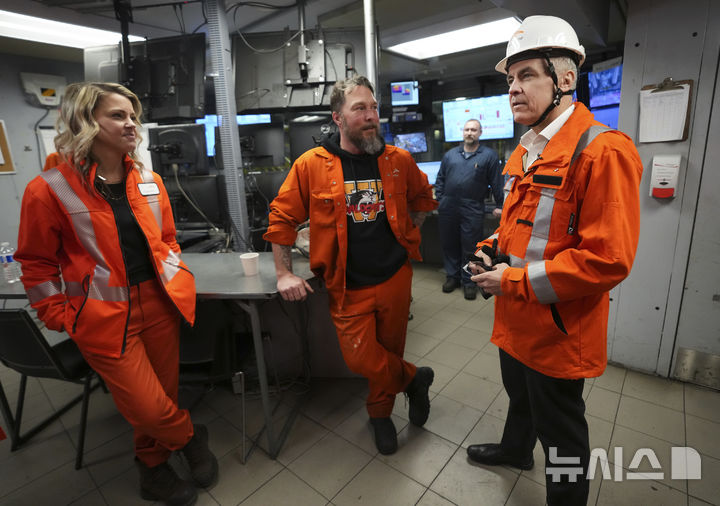 [해밀턴=AP/뉴시스] 마크 카니(오른쪽) 캐나다 차기 총리가 12일(현지 시간) 온타리오주 해밀턴에 있는 아르셀로미탈 도파스코 제철소를 방문해 직원들과 얘기하고 있다. 캐나다는 미국의 '철강·알루미늄 25% 관세 부과에 대해 13일부터 미국 제품 210억 달러어치에 25% 보복관세를 물리기로 한 것으로 알려졌다. 2025.03.13.