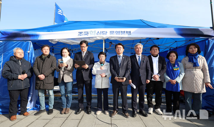 [서울=뉴시스] 이영환 기자 = 김선민 조국혁신당 대표 권한대행이 13일 오전 서울 종로구 광화문 조국혁신당 천막에서 열린 최고위원회의에 참석해 발언을 하고 있다. 2025.03.13. [email protected]