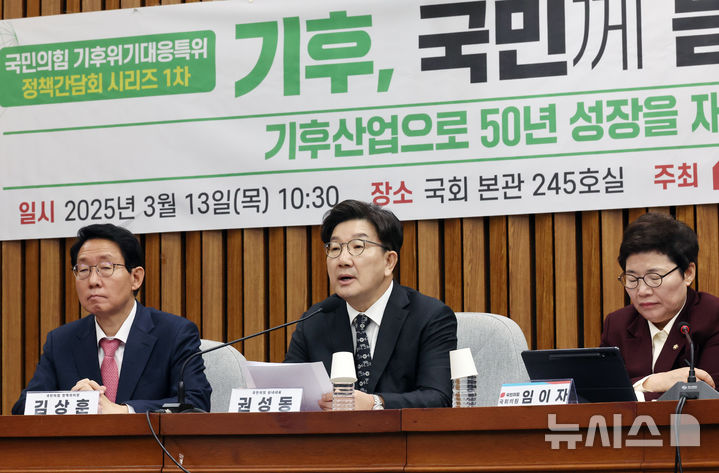 [서울=뉴시스] 조성우 기자 = 13일 오전 서울 여의도 국회에서 국민의힘 기후위기대응특별위원회 주최로 열린 '기후, 국민께 듣겠습니다' 정책간담회 시리즈 1차 '기후산업으로 50년 성장을 재현하다'에서 권성동(가운데) 원내대표가 발언하고 있다. 왼쪽부터 김상훈 정책위의장, 권 원내대표, 임이자 기후특위 위원장. 2025.03.13. [email protected]