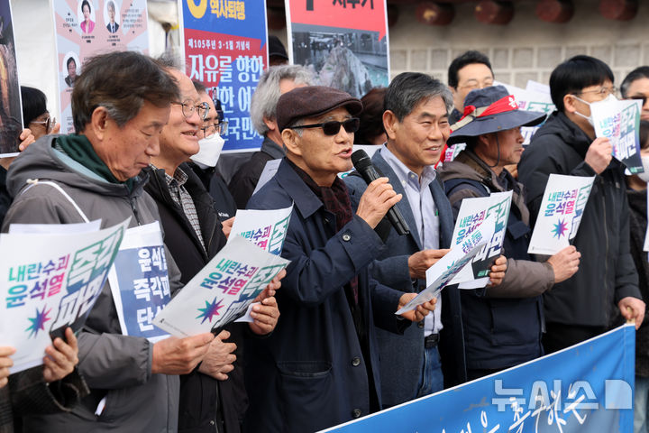 [서울=뉴시스] 배훈식 기자 = 민족문제연구소 회원들이 13일 오전 서울 종로구 광화문 서십자각터에서 비상시국선언 기자회견을 열고 내란 우두머리 윤석열의 신속 파면을 촉구하고 있다. 2025.03.13. [email protected]