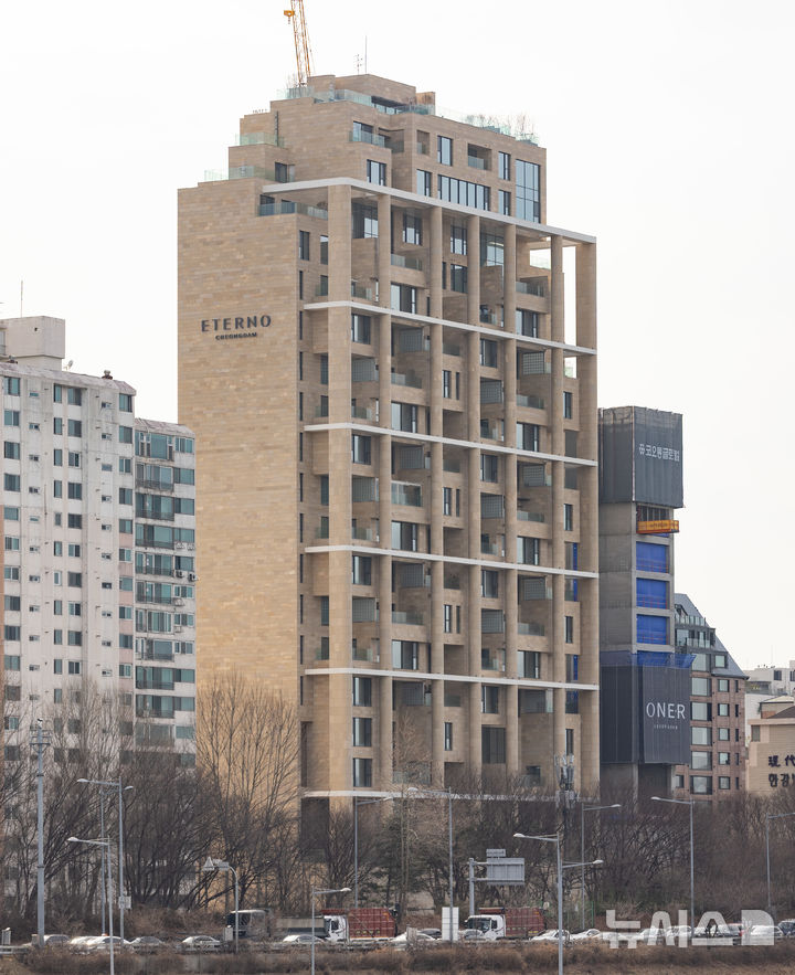 [서울=뉴시스] 황준선 기자 = 13일 국토교통부가 발표한 2025년 공동주택 공시가격안에 따르면 전국 공동주택 1558만호 중 가장 가격이 높은 공동주택은 '에테르노청담' 아파트 전용면적 464.11㎡이 200억6000만원으로 '더펜트하우스 청담'(164억원)을 제치고 가장 비싼 아파트로 나타났다. 사진은 이날 서울 강남구 에테르노 청담 모습. 2025.03.13. [email protected]