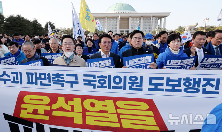 [서울=뉴시스] 조성우 기자 = 박찬대(앞줄 오른쪽 세 번째) 더불어민주당 원내대표 등 의원들이 13일 오후 서울 여의도 국회에서 광화문 방향으로 윤석열 대통령 파면을 촉구하는 도보행진을 하고 있다. 2025.03.13. [email protected]