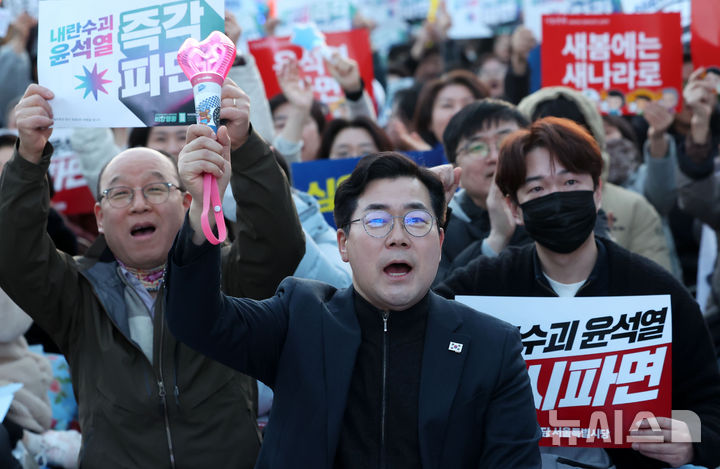 [서울=뉴시스] 홍효식 기자 = 13일 서울 종로구 동십자각에서 열린 윤석열 대통령 퇴진을 촉구하는 야5당 공동 비상시국 범국민대회에 참석한 박찬대 더불어민주당 원내대표가 구호를 외치고 있다. 2025.03.13. [email protected]