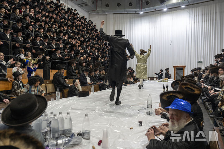 [하이파=AP/뉴시스] 13일(현지 시간) 이스라엘 하이파에서 초정통파 유대인 남성들과 축제 의상을 차려 입은 아이들이 '부림절' 축제를 즐기고 있다. 부림절은 구약성서의 에스더가 페르시아 총리 하만의 음모로부터 유대인을 구해냈다는 것을 기념하는 축제로 이날 유대인들은 에스더서를 읽고 '하만의 귀'라고 불리는 과자를 먹으며 축제를 즐긴다. 2025.03.15.