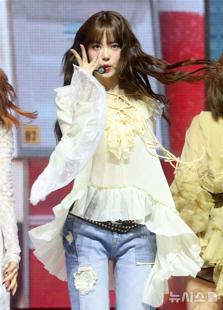 [서울=뉴시스] 김혜진 기자 = 그룹 르세라핌 홍은채가 14일 오전 서울 광진구 예스24라이브홀에서 열린 다섯 번째 미니앨범 'HOT(핫)' 발매 기념 쇼케이스에서 무대를 선보이고 있다.