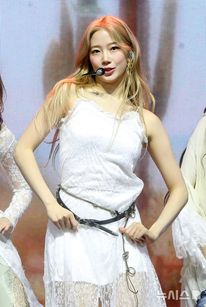 [서울=뉴시스] 김혜진 기자 = 그룹 르세라핌 카즈하가 14일 오전 서울 광진구 예스24라이브홀에서 열린 다섯 번째 미니앨범 'HOT(핫)' 발매 기념 쇼케이스에서 무대를 선보이고 있다.