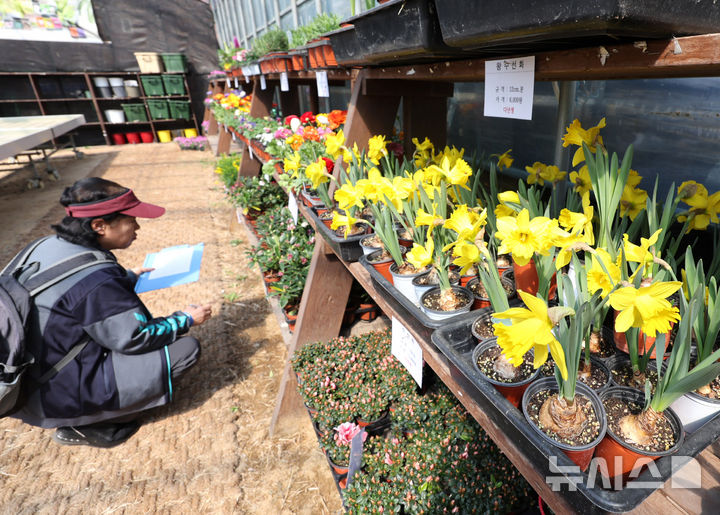 [인천=뉴시스] 전진환 기자 = 따듯한 봄 날씨를 보인 14일 오후 인천 남동구 인천산림조합 나무시장에서 한 시민이 화단에 심을 꽃을 살펴보고 있다. 2025.03.14. [email protected]