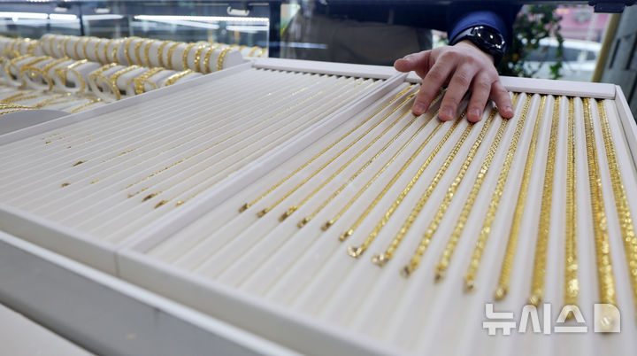 [서울=뉴시스] 홍효식 기자 = 국제 금값이 온스 당 3000달러를 돌파하며 사상 최고치를 경신한 14일 서울 종로구 금거래소 종로본점에 금이 진열되어 있다.