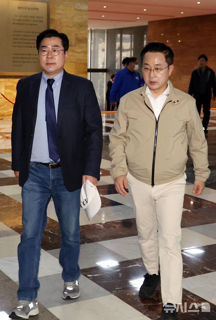 [서울=뉴시스] 조성봉 기자 = 박찬대 더불어민주당 원내대표와 박성준(오른쪽) 원내수석부대표가 14일 오후 서울 여의도 국회에서 열린 비상의원총회에 참석하고 있다. 2025.03.14. [email protected]