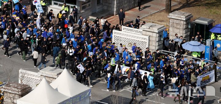 [서울=뉴시스] 조성봉 기자= 박찬대 더불어민주당 원내대표, 김선민 조국혁신당 권한대행, 임명희 사회민주당 부대표와 야당 의원들이 14일 오후 서울 여의도 국회에서 '내란수괴 윤석열 파면'을 촉구하며 광화문을 향해 도보행진을 하고 있다. 2025.03.14. [email protected]