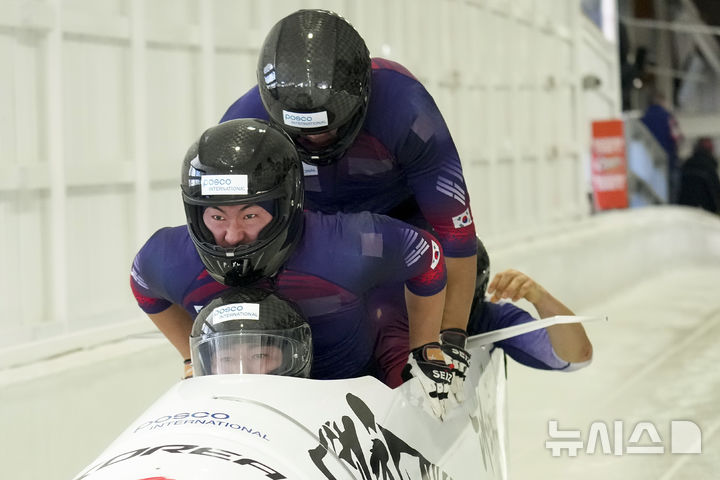 [레이크플래시드=AP/뉴시스] 김진수, 김선욱, 김형근, 이진화가 14일(현지 시간) 미 뉴욕주 레이크플래시드에서 열린 2024-25 국제봅슬레이스켈레톤연맹(IBSF) 봅슬레이 세계 선수권 대회 남자 4인승 2차 시기 경기를 펼치고 있다. 2025.03.15.