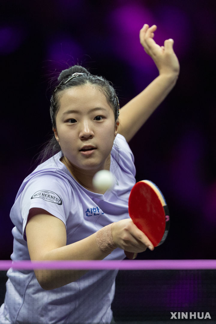 [충칭=신화/뉴시스] 신유빈(10위)이 14일(현지 시간) 중국 충칭에서 열린 월드테이블테니스(WTT) 챔피언스 충칭 2025 여자 단식 2회전(16강)에서 천싱퉁(4위·중국)과 경기하고 있다. 신유빈이 0-3(10-12 8-11 1-11)으로 완패하며 탈락해 이번 대회에 출전한 한국 선수 전원이 탈락했다. 2025.03.15.