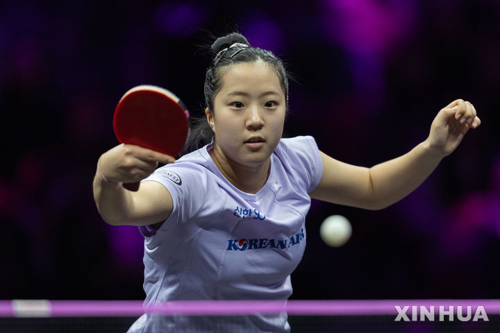 [충칭=신화/뉴시스] 신유빈(10위)이 14일(현지 시간) 중국 충칭에서 열린 월드테이블테니스(WTT) 챔피언스 충칭 2025 여자 단식 2회전(16강)에서 천싱퉁(4위·중국)과 경기하고 있다. 신유빈이 0-3(10-12 8-11 1-11)으로 완패하며 탈락해 이번 대회에 출전한 한국 선수 전원이 탈락했다. 2025.03.15.