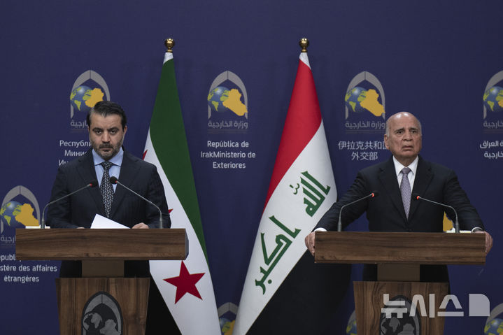 [바그다드(이라크)=AP/뉴시스]아사드 알 샤이바니 시리아 외무장관(왼쪽)이 14일(현지시각) 이라크 바그다드에서 푸아드 후세인 이라크 외무장관과 기자회견을 하고 있다. 이라크 국가정보국(IS) 요원들이 미국 주도의 연합군과의 합동 작전으로 이라크와 시리아의 이슬람국가(IS) 수장을 사살했다고 이라크 총리가 14일(현지시각) 밝혔다. 2025.03.15.