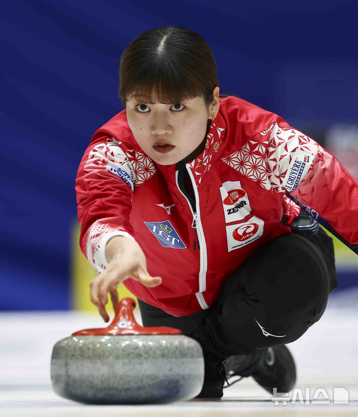 [의정부=뉴시스] 김근수 기자 = 15일 경기 의정부빙상장에서 열린 2025 LGT 세계여자컬링선수권대회 대한민국과 일본의 경기에서 일본 여자컬링 대표팀 선수들이 스톤을 투구하고 있다.  2025.03.15. [email protected]