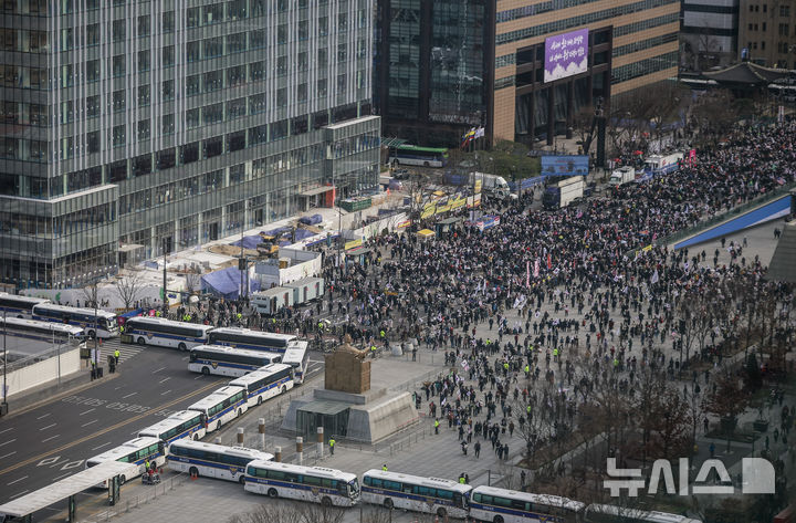 [서울=뉴시스] 정병혁 기자 = 윤석열 대통령에 대한 헌법재판소의 탄핵심판 선고가 임박한 15일 오후 서울 종로구 세종대로 일대에서 열린 자유통일당의 '3.15 광화문국민대회'에서 참가자들이 도로를 가득 메우고 있다.2025.03.15. [email protected]