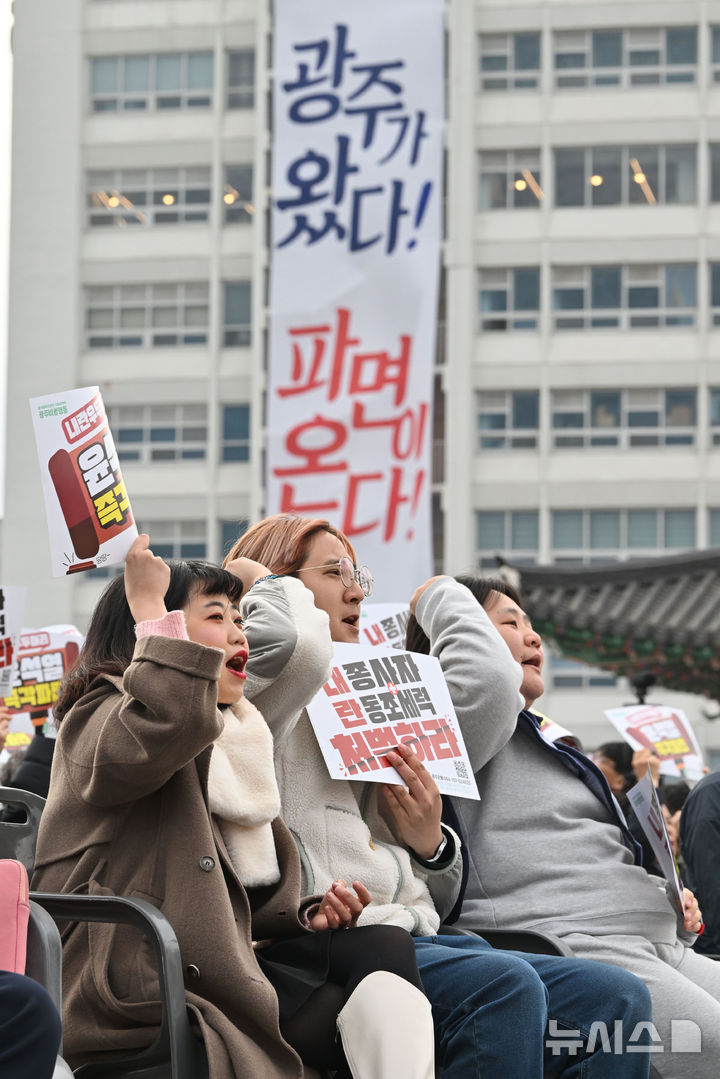 [광주=뉴시스] 이영주 기자 = 윤석열정권 즉각퇴진·사회대개혁 광주비상행동이 15일 오후 광주 동구 5·18민주광장에서 18차 광주시민총궐기대회를 열고 있다. 집회에 참여한 시민들이 헌법재판소를 향해 윤 대통령 파면을 촉구하고 있다. [email protected]
