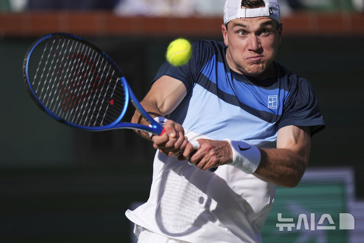 [인디언웰스=AP/뉴시스] 잭 드레이퍼(14위·영국)가 15일(현지 시간) 미 캘리포니아주 인디언웰스에서 열린 남자프로테니스(ATP) 투어 BNP 파리바 오픈 단식 준결승에서 카를로스 알카라스(3위·스페인)와 경기하고 있다. 드레이퍼가 2-1(6-1 0-6 6-4)로 승리하고 결승에 올라 홀게르 루네(13위·덴마크)와 우승을 다툰다. 2025.03.16.
