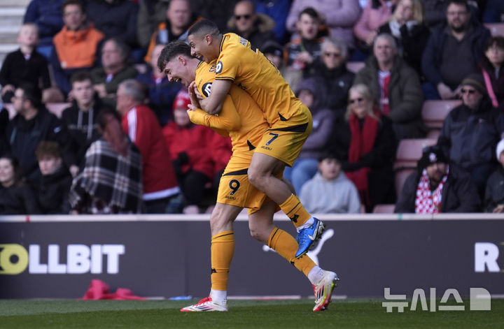 [사우샘프턴=AP/뉴시스] 울버햄프턴 원더러스의 예르겐 스트란 라르센(9)이 15일(현지 시간) 영국 사우샘프턴의 세인트 메리스 스타디움에서 열린 2024-25 프리미어리그 29라운드 사우샘프턴과 경기 후반 2분 멀티 골을 완성하며 동료와 환호하고 있다. 황희찬이 결장한 울버햄프턴은 라르센의 멀티 골에 힘입어 2-1로 승리하고 리그 17위를 유지했다. 2025.03.16.