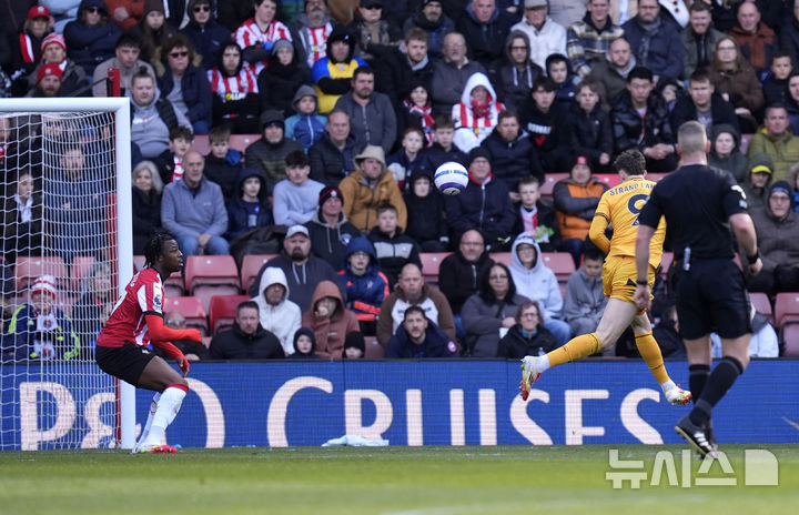 [사우샘프턴=AP/뉴시스] 울버햄프턴 원더러스의 예르겐 스트란 라르센(9)이 15일(현지 시간) 영국 사우샘프턴의 세인트 메리스 스타디움에서 열린 2024-25 프리미어리그 29라운드 사우샘프턴과 경기 전반 19분 선제골을 넣고 있다. 황희찬이 결장한 울버햄프턴은 라르센의 멀티 골에 힘입어 2-1로 승리하고 리그 17위를 유지했다. 2025.03.16.