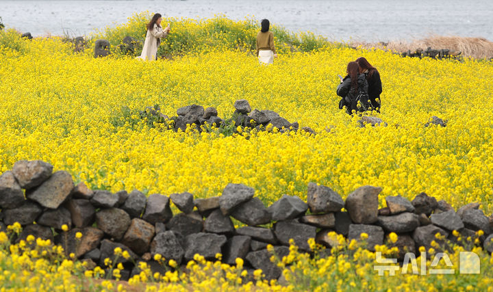 [서귀포=뉴시스] 우장호 기자 = 제주 지역에 강한 바람이 불고 있는 16일 오전 서귀포시 성산일출봉 광치기해변 인근 유채꽃밭을 찾은 관광객들이 궂은 날씨에도 봄정취를 즐기고 있다. 2025.03.16. [email protected]