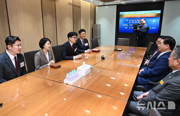 [서울=뉴시스] 국회사진기자단 = 한동훈(왼쪽 세 번째) 전 국민의힘 대표가 16일 서울 영등포구 여의도 순복음교회에서 열린 예배에 참석한 후 이영훈(오른쪽 두 번째) 담임목사와 만나 대화하고 있다. 2025.03.16. [email protected]