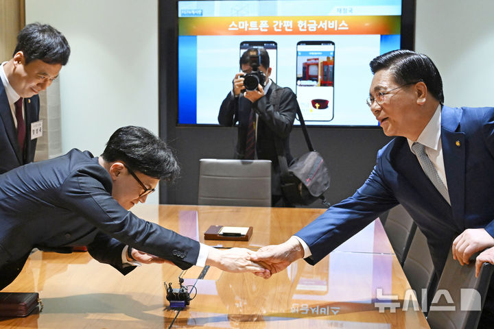 [서울=뉴시스] 국회사진기자단 = 한동훈 전 국민의힘 대표가 16일 서울 영등포구 여의도 순복음교회에서 열린 예배에 참석한 후 이영훈 담임목사와 인사하고 있다. 2025.03.16. [email protected]