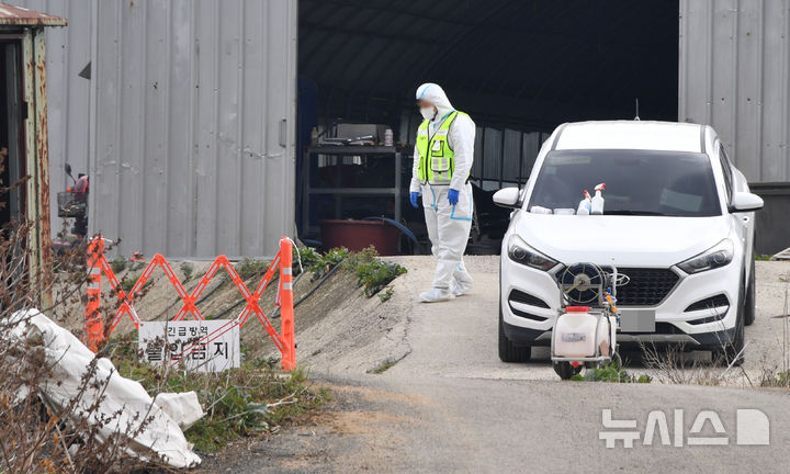 [무안=뉴시스] 변재훈 기자 = 16일 오전 전남 무안군 일로읍 소재 구제역 발생 소 사육농장에서 방역 당국이 출입 통제선을 설치, 소독을 준비하고 있다. 2025.03.16. [email protected]
