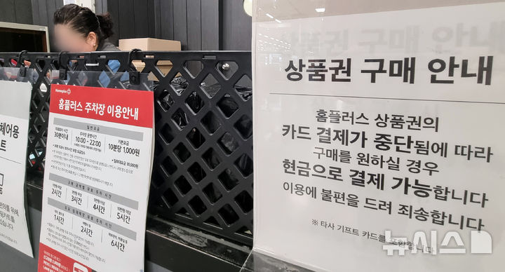 [서울=뉴시스] 김금보 기자 = 16일 서울시내 홈플러스 한 지점에 상품권 구매 카드 결제 중단 안내문이 게시돼있다.