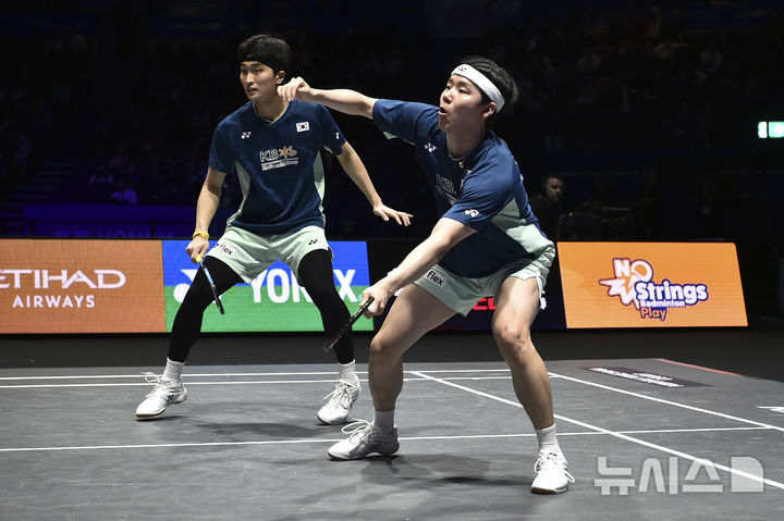 [버밍엄=AP/뉴시스] 서승재(오른쪽)와 김원호가 16일(현지 시간) 영국 버밍엄의 유틸리타 아레나에서 열린 세계배드민턴연맹(BWF) 전영오픈 남자복식 결승에서 레오 롤리 카르난도-바가스 마울라나 조(인도네시아)와 경기하고 있다. 서승재-김원호가 2-0(21-19 21-19)으로 승리하고 13년 만에 전영오픈 정상에 올랐다. 2025.03.17.