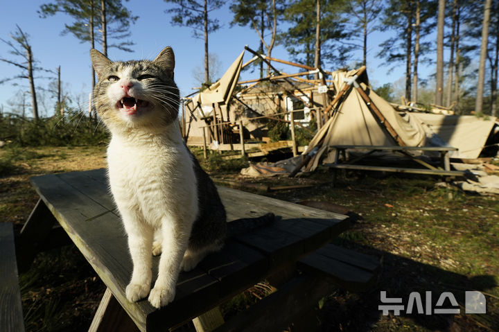 [타일러타운=AP/뉴시스] 16일(현지 시간) 미 미시시피주 타일러타운의 파라다이스 랜치 RV 리조트에서 고양이 한 마리가 토네이도로 파괴된 오두막 앞에 앉아 울고 있다. 지난 15일과 16일에 걸쳐 미 중남부를 중심으로 토네이도를 동반한 폭풍으로 6개 주에서 지금까지 최소 37명이 숨진 것으로 알려졌다. 2025.03.17.