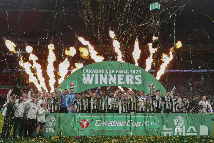 [런던=AP/뉴시스] 뉴캐슬 유나이티드 선수들이 16일(현지 시간) 영국 런던의 웸블리 스타디움에서 열린 2024-25 카라바오컵(EFL) 정상에 올라 트로피를 중심으로 기념 촬영하고 있다. 뉴캐슬은 결승전에서 리버풀을 2-1로 꺾고 창단 132년 만에 첫 EFL컵을 들어 올렸다. 2025.03.17.