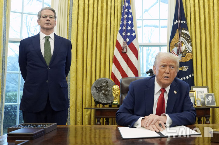[워싱턴=AP/뉴시스]스콧 베센트 미 재무장관이 지난 2월3일 워싱턴 백악관 집무실에서 행정명령 서명을 준비하는 도널드 트럼프 대통령의 연설을 경청하고 있다. 그는 7일 "도널드 트럼프 미 대통령의 재임 중 미국 경제가 경기침체에 직면하지 않을 것이라는 보'은 없다"고 말했다. 2025.03.17.