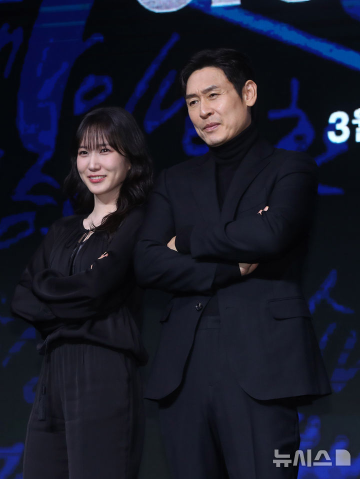 [서울=뉴시스] 김혜진 기자 = 배우 박은빈(왼쪽), 설경구가 17일 오전 서울 영등포구 콘래드 서울에서 열린 디즈니 플러스 새 시리즈 '하이퍼나이프' 제작발표회에서 포즈를 취하고 있다.