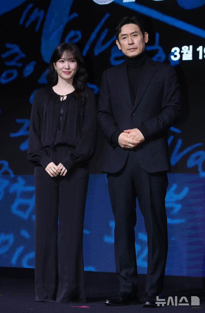 [서울=뉴시스] 김혜진 기자 = 배우 박은빈(왼쪽), 설경구가 17일 오전 서울 영등포구 콘래드 서울에서 열린 디즈니 플러스 새 시리즈 '하이퍼나이프' 제작발표회에서 포즈를 취하고 있다.
