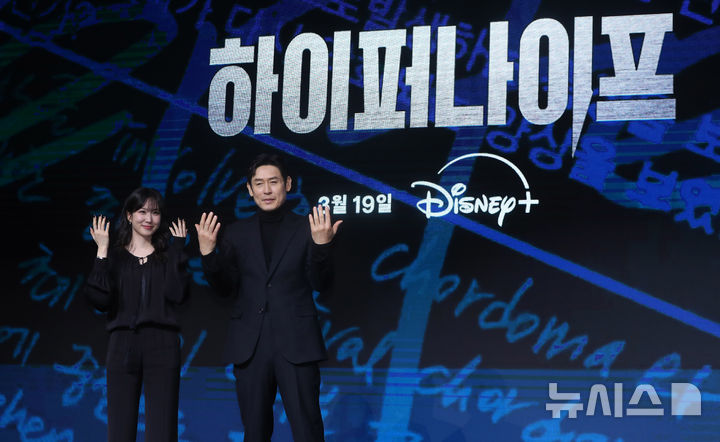 [서울=뉴시스] 김혜진 기자 = 배우 박은빈(왼쪽), 설경구가 17일 오전 서울 영등포구 콘래드 서울에서 열린 디즈니 플러스 새 시리즈 '하이퍼나이프' 제작발표회에서 포즈를 취하고 있다.
