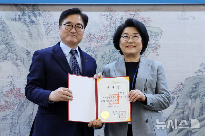 [서울=뉴시스] 조성우 기자 = 우원식(왼쪽) 국회의장이 17일 오전 서울 여의도 국회에서 열린 국민 미래 개헌 자문위원회 위촉식 및 제3차 회의에서 이혜훈 위원장에게 위촉장을 전달한 뒤 기념촬영하고 있다. 2025.03.17. [email protected]