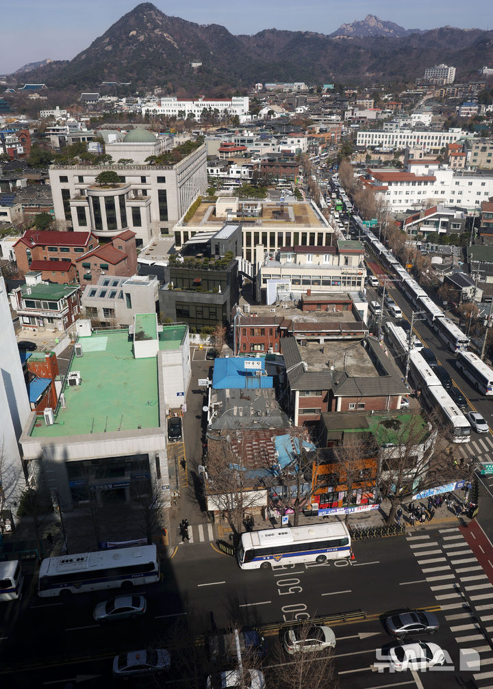 [서울=뉴시스] 홍효식 기자 = 윤석열 대통령의 탄핵 심판 선고를 앞둔 17일 서울 종로구 헌법재판소 일대가 경찰 기동대 버스로 둘러싸여 있다. 2025.03.17. [email protected]
