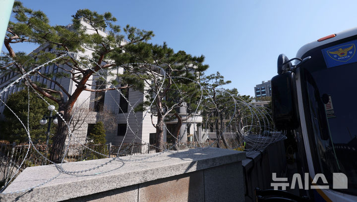 [서울=뉴시스] 홍효식 기자 = 윤석열 대통령의 탄핵 심판 선고를 앞둔 17일 서울 종로구 헌법재판소 울타리에 철조망이 설치돼 있다. 2025.03.17. [email protected]
