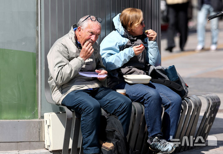 [대구=뉴시스] 이무열 기자 = 전국 대부분 지역에 꽃샘추위가 찾아온 17일 오후 대구 중구 동성로에서 외국인 부부가 따뜻한 햇볕이 드는 의자에 앉아 샌드위치를 먹고 있다. 2025.03.17. [email protected]
