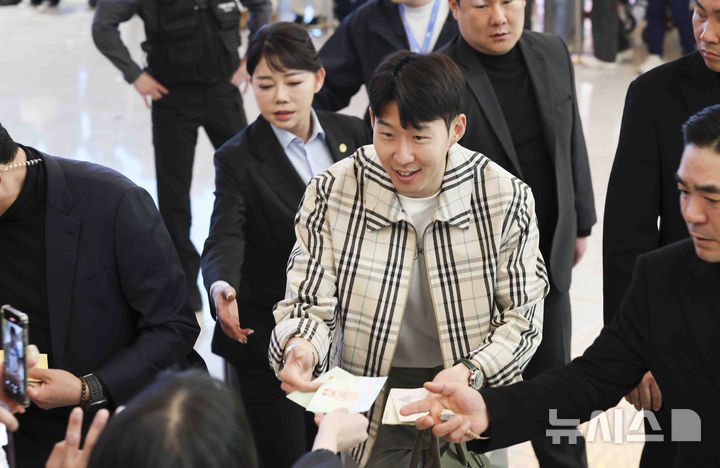 [인천공항=뉴시스] 김근수 기자 = 축구 국가대표팀 주장 손흥민이 17일 오후 인천국제공항 제2여객터미널을 통해 입국해 팬들과 인사를 나누고 있다. 2025.03.17. [email protected]