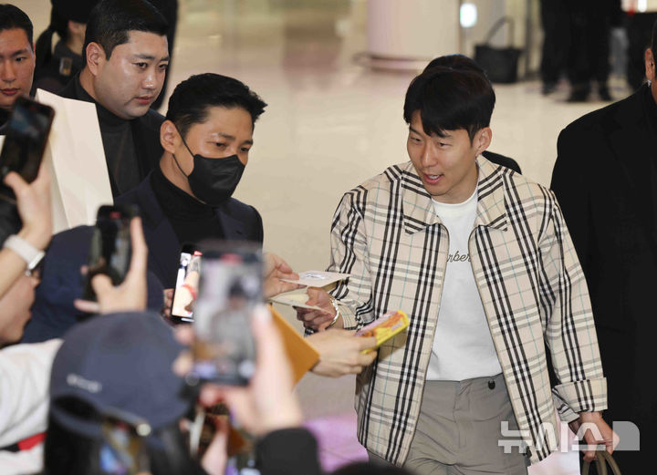 [인천공항=뉴시스] 김근수 기자 = 축구 국가대표팀 주장 손흥민이 17일 오후 인천국제공항 제2여객터미널을 통해 입국해 팬들과 인사를 나누고 있다. 2025.03.17. [email protected]