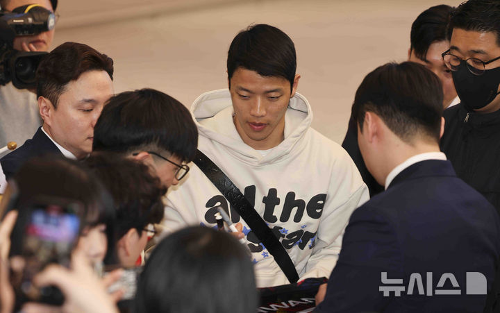 [인천공항=뉴시스] 김근수 기자 = 축구 국가대표팀 황희찬이 17일 오후 인천국제공항 제2여객터미널을 통해 입국해 팬들과 인사를 나누고 있다. 2025.03.17. [email protected]