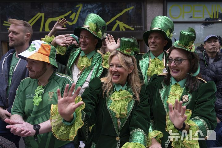 [뉴욕=AP/뉴시스] 17일(현지 시간) 미 뉴욕주 뉴욕에서 제264회 성 패트릭의 날 퍼레이드가 열려 녹색 옷을 입은 사람들이 행렬을 향해 손을 흔들고 있다. 2025.03.18.